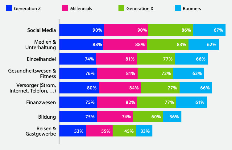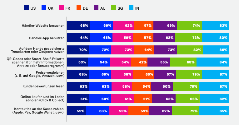 Da die Grenzen zwischen physischen und digitalen Erlebnissen immer mehr verschwimmen, gab mehr als die Hälfte der Befragten in allen Ländern an, dass sie ihr Smartphone im Geschäft wahrscheinlich für acht verschiedene Aktivitäten nutzen. Dazu gehören das Öffnen der App eines Einzelhändlers, die Verwendung von Kundenkarten und Coupons oder das Scannen eines QR-Codes. Auch hier sind die Millennials führend, aber auch ein beträchtlicher Prozentsatz der Babyboomer gab an, dass sie ihr Smartphone beim Einkaufsbummel benutzen. Das bietet den Marken eine gute Gelegenheit, ältere Generationen anzusprechen und ihnen in der Filiale oder über eine App zu zeigen, wie die Nutzung ihrer Smartphones ihr Einkaufserlebnis im Geschäft verbessern können.