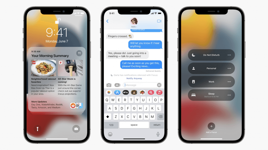 Benachrichtigungen werden feinkörnige Einstellungen erhalten. Benutzer können festlegen, welche Mitteilungen sie sofort empfangen möchten und welche sie als „Zusammenfassung“ gruppiert und zu einer bestimmten Zeit lesen möchten. Die Zusammenfassung ordnet die Benachrichtigungen nach Priorität, basierend auf den App-Gewohnheiten der Benutzer und ihren Einstellungen, wobei persönliche Nachrichten ausgenommen sind.