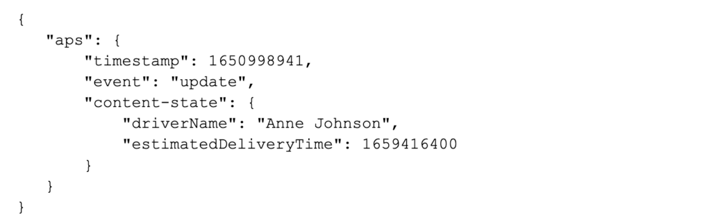 Live Activities further adds to the complexity of push notifications as each Live Activity has its own pushToken to manage. Live Activities are active for up to 8 hours unless your app or the user explicitly ends it. Your app can update the content of a Live Activity from your app if it is active and can use push notifications to update it whether it is active or suspended. Each update to your Live Activity can include up to 4KB of data. Here is a very simple example of a push notification that updates the driver name and estimated delivery time of a Live Activity :