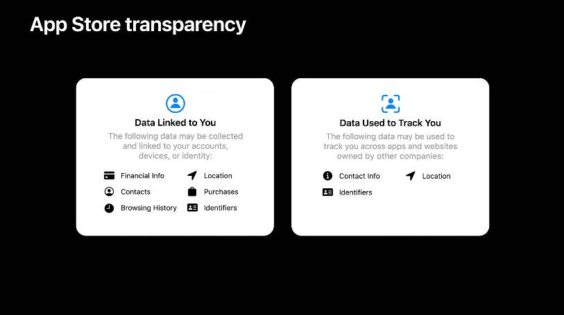 Starting this fall, when developers submit to the App Store for review, they will have to fill out a questionnaire answering questions about data use. Users can, in turn, see how your app is going to use their data directly on your app store page prior to downloading. This will inform the user as to how much sensitive data you link to them, such as financial information, location, contacts, and browsing history, and whether or not that data is used to track them across apps and websites owned by other companies.