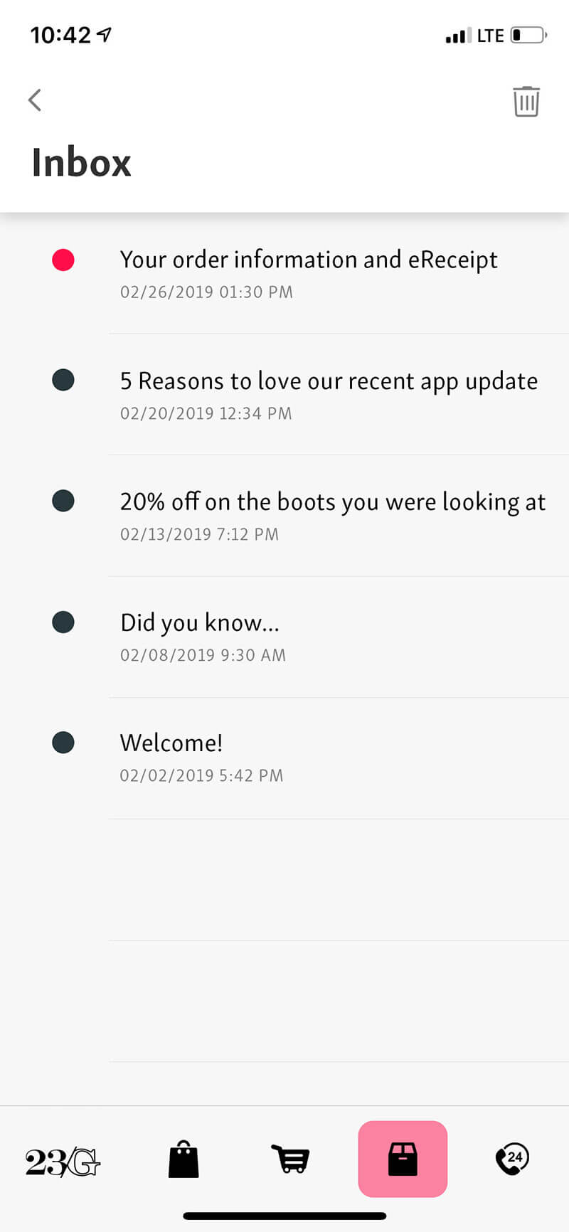 How many of your app customers are opted-in to receive push notifications? Unless that number is 100% (we don’t know anyone who’s there) then Message Center is your BFF. It’s a non-interruptive way to show them the value of regularly opening your app — and staying connected with your brand.
