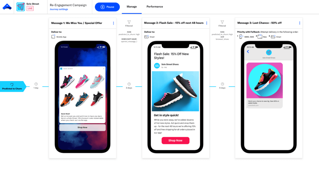 Airship Journeys guides you to create campaigns based on specific customer engagement goals — like making a purchase or opening an account. Leverage Predictive AI to automatically place customers into (or remove them from) journeys based on their propensity to churn and deliver your message on the best channel to reach them.