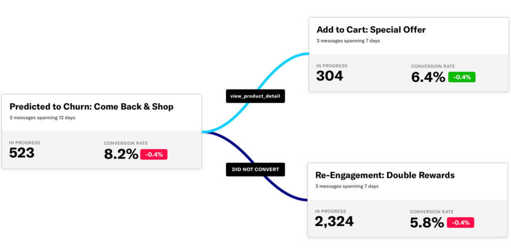 - Minimize churn: create a re-engagement journey for users at high risk of churning from your website or app, sending a series of email and in-app message center messages highlighting features, offers and one-time incentives to take action toward specific goals like purchases or session frequency.