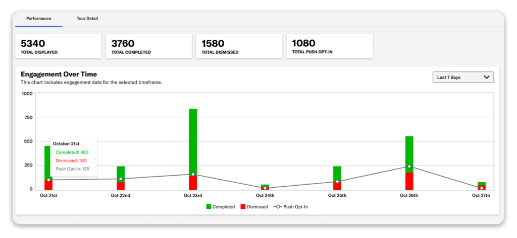Präsentieren Sie den Nutzen Ihrer App mit gezielten attraktiven Führungen, die auf den Attributen des Kunden und seinem Echtzeitverhalten basieren. Lösen Sie automatisch eine Willkommenstour aus, um neue Kunden anzulocken und zu informieren. Fördern Sie die Akzeptanz mit einer Führung für Kunden, die eine bestimmte Funktion noch nicht genutzt haben. Oder stellen Sie Ihr Treueprogramm vor und beobachten Sie, wie das Engagement wächst!