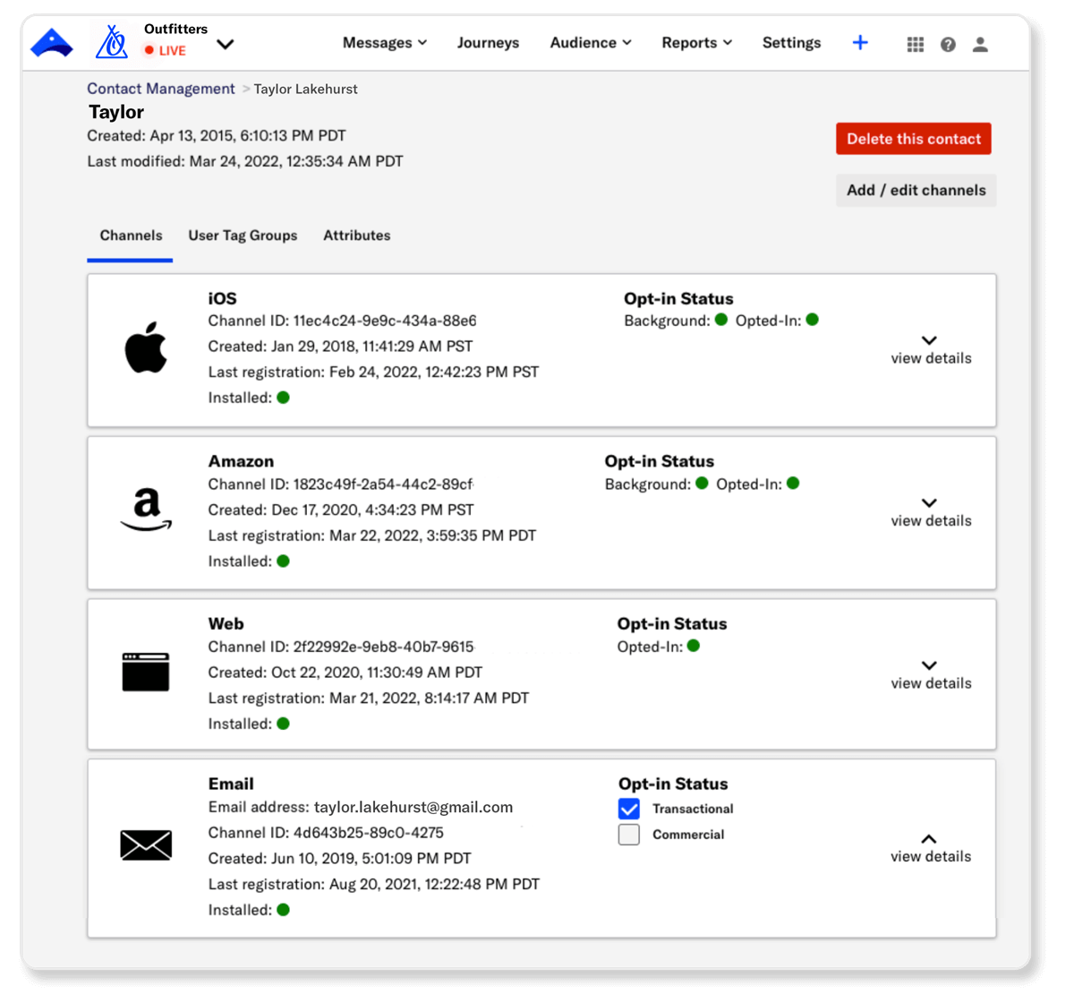 Update any known contacts with associated channels or devices to easily orchestrate experiences for those contacts.