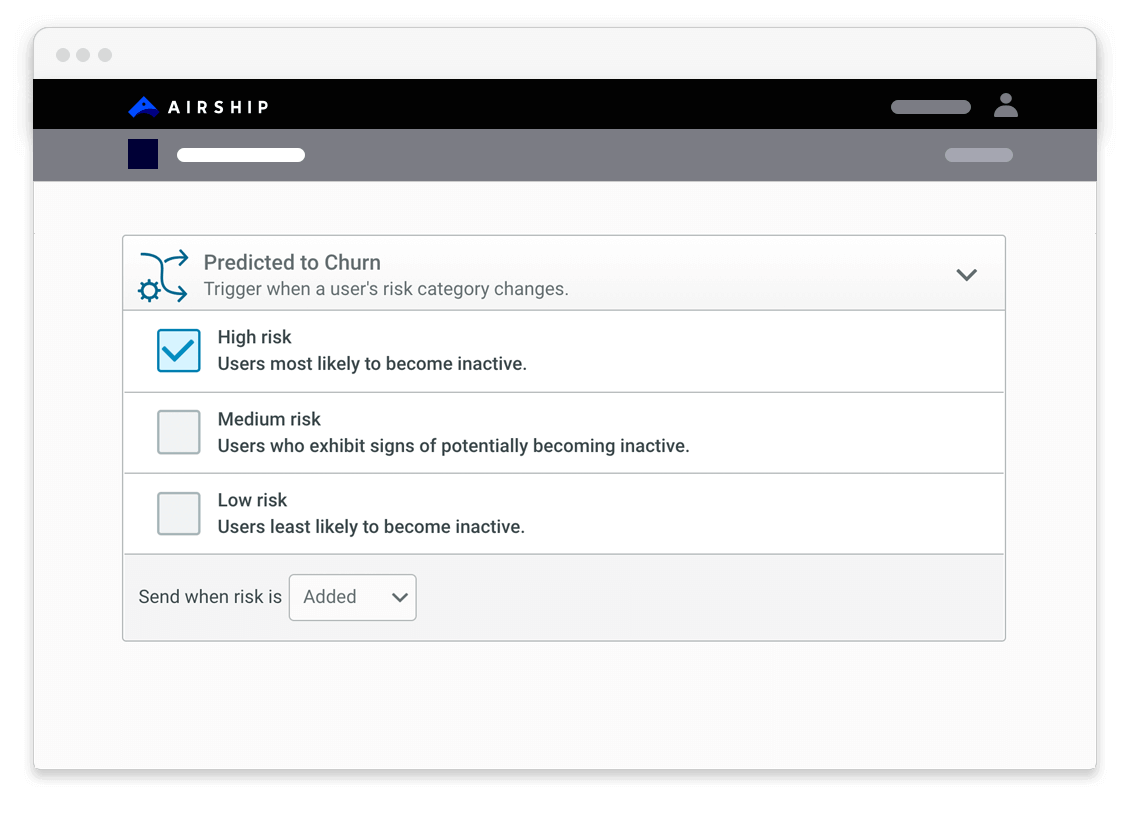 Airship’s Predictive Churn shows us which of our users are at low, medium or high risk of churn. With that data, we can re-engage customers we might otherwise have lost — and quickly see how effective our re-engagement efforts are at retaining them.”