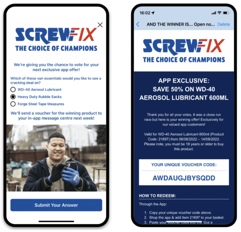 Les expériences axées sur l’engagement constituent le moyen le plus efficace de garantir que les clients génèrent les résultats que vous attendez. Que ce soit en les incitant à consommer davantage de contenu, en leur rappelant la présence d’articles dans leur panier ou en gamifiant leur expérience, ce type d’expérience favorise les interactions sur l’application et accroît la notoriété de la marque, le partage de données et la monétisation.