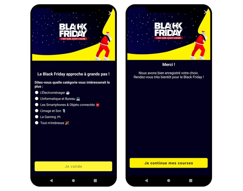 Carrefour a ainsi créé une campagne in-app lors du Black Friday pour mieux connaître ses clients. L’entreprise a demandé à ses clients quels types de promotion les intéressaient pour le Black Friday, et a ensuite proposé des recommandations de produits en fonction des réponses données. Ce type de data peut être utilisé à l’instant T pour faire avancer le client sur son parcours d’achat, mais aussi plus tard à des fins de segmentation et de ciblage.