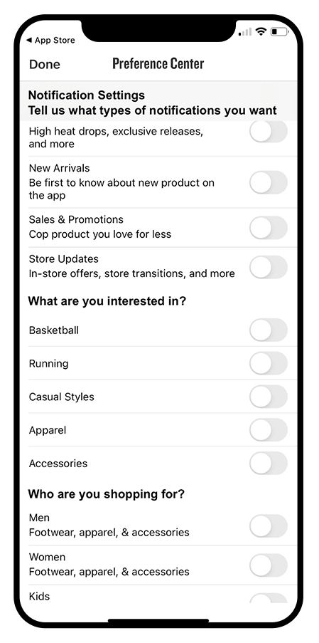 Les meilleures marques avec lesquelles nous travaillons créent des expériences in-app qui permettent un échange de valeur mutuel entre le client et la marque. La première étape est de compléter les profils clients via leurs préférences, mais aussi les enquêtes et la gamification, afin d’attirer leur intérêt et de récompenser les interactions. Les résultats sont éloquents : d’après une étude Airship, on observe un lift de 82 % des taux d’ouverture directe et de 91 % des achats attribuables aux notifications push chez les retailers qui ont mis en place un Centre de préférences Airship et ensuite exploité les données pour mieux cibler leur audience — par opposition à ceux qui envoient les mêmes messages à l’ensemble de leurs clients.
