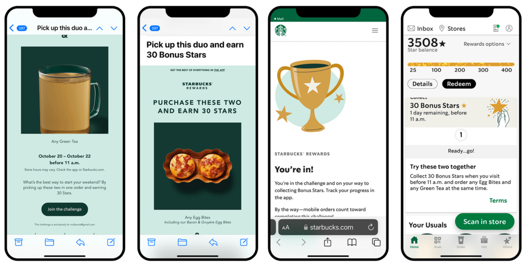 Dans l’exemple ci-dessus, les clients reçoivent un e-mail contenant les détails du défi proposé et sont invités à y participer. Chaque fois qu’ils ouvrent l’application mobile, leur progression s’affiche. Starbucks a créé ici une expérience client gagnante qui intègre le comportement client, leurs préférences et l’engagement multicanal pour les inciter à revenir. Les e-mails envoyés offrent un accès facile à l’application et au site web pour passer commande. Le centre de messagerie s’affiche sur la page d’accueil de l’application mobile, ce qui fait apparaître les derniers bons plans et défis et renforce le rôle central de l’application.