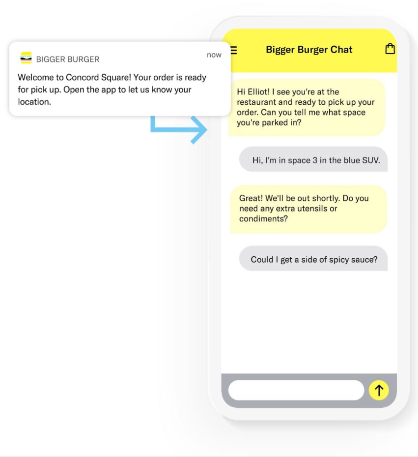 Personalized SMS and email messages are no-brainers for order confirmations and pickup details. But if you want to build a next level experience, try delivering personalized Mobile Wallet passes via email or SMS. Wallet passes make it easier for customers to keep track of their orders. And they tend to hang onto those passes, giving you another way to stay engaged! You’ll also want to encourage app downloads and opt-ins so that customers can take advantage of BOPIS 2.0 features like arrival detection and live in-app chat.