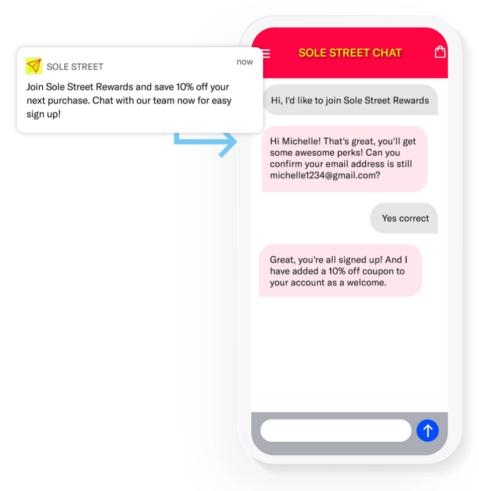 While many brands turn to AI chatbots for in-the-moment engagement and support, the reality is that most people (86%) prefer talking with another human. And when the customer’s only other options are emailing or calling, that creates friction that increases the chances they’ll walk away. The key to Live Chat is the ability to trigger 1-to-1 chat interactions from any marketing channel in those pivotal moments. Trigger live chat opportunities based on customer actions, location, behavior, or any other data that makes sense for your brand, so you can be there to:
