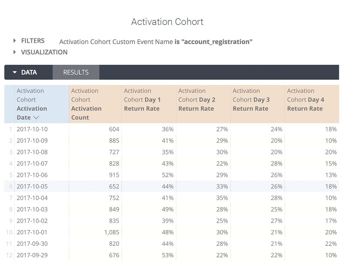 Discover the moments in your app experience that lead to above average retention. The Activation Heatmap Report allows you to see the impact a specific event (i.e. completing a profile, achieving a goal or using a specific feature) has on user retention. Choose any captured event to model which activities drive desired outcomes, then focus on engaging those segments with targeted messaging.