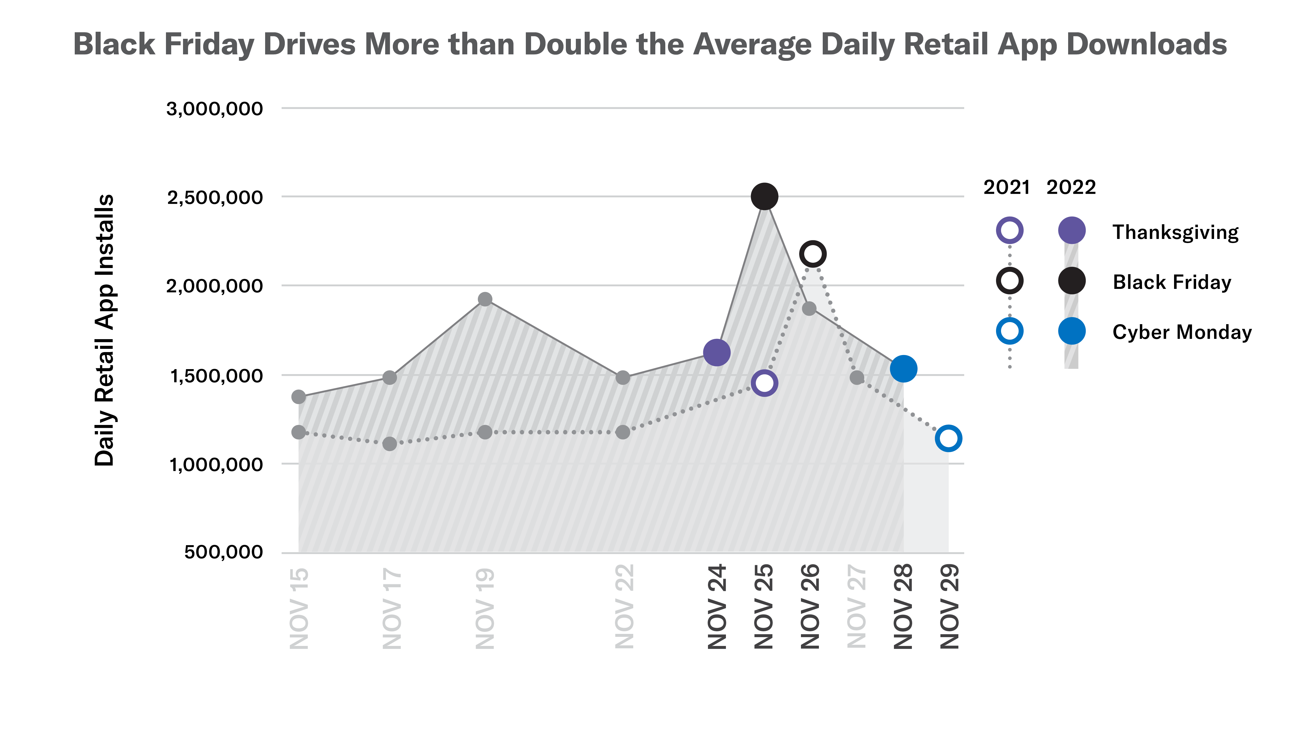 Black Friday continues to be the top day of the year for people to add a retail app to their phones — at nearly double the daily average holiday season. New from last year, people added retail apps to their phones at a greater and sustained rate starting in early November. Three of the top five app install days in 2022 were November 18 through 20.