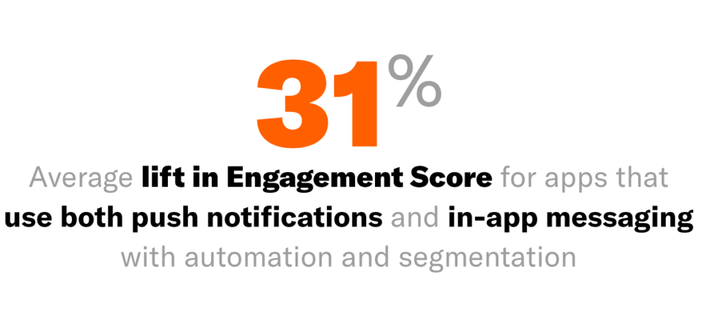 Utilizing automated push notifications alone or automated in-app messaging alone is not enough.  Brands that are doing well at engagement are using a combination of automated push and in-app messaging.  This combination of channels allows brands to reach customers outside of the app and engage them contextually while they are in the app.